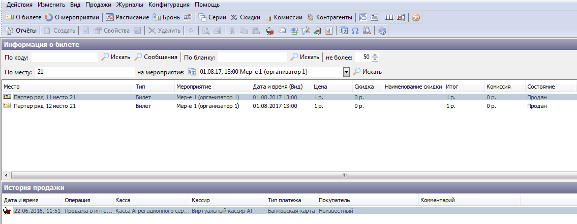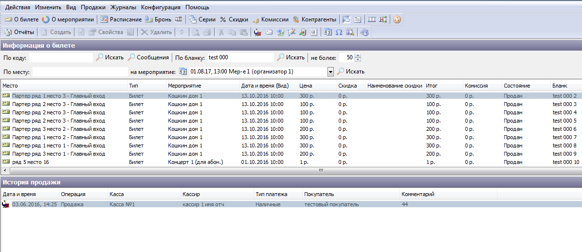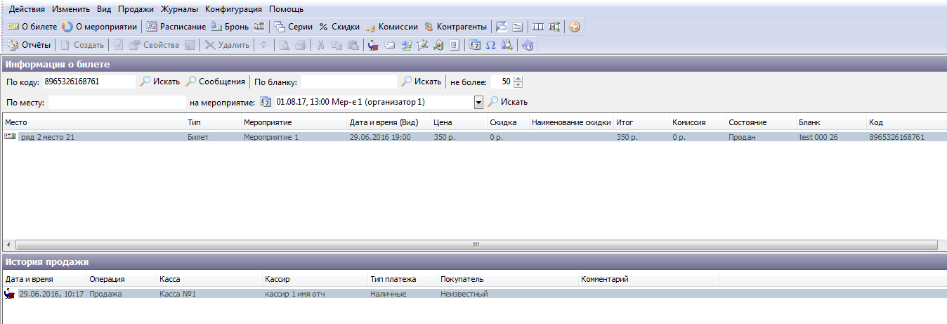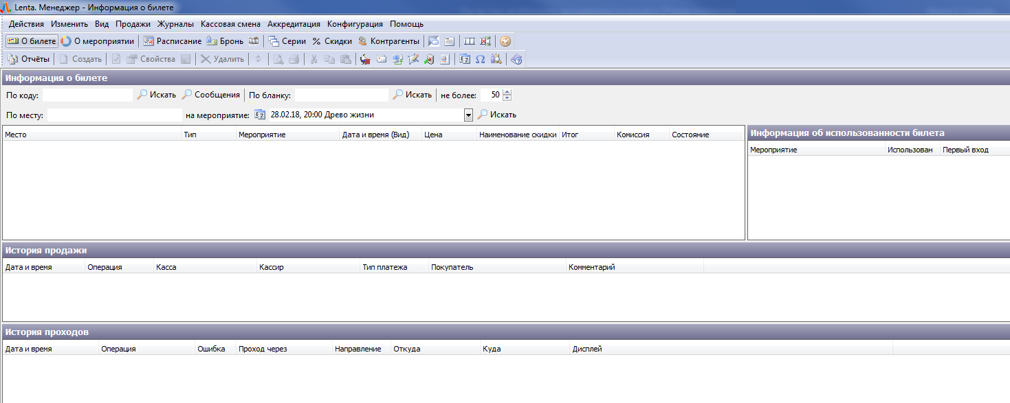 • «История продажи» содержит данные об операции продажи данного билета: кассе, кассире, типе платежа и покупателе.