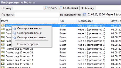 Можно скопировать в буфер обмена информацию о месте, бланке или о штрихкоде билета. Для этого, кликните правой кнопкой мыши на билете в разделе «Информация о билете» и в контекстном меню выберите нужный пункт.
